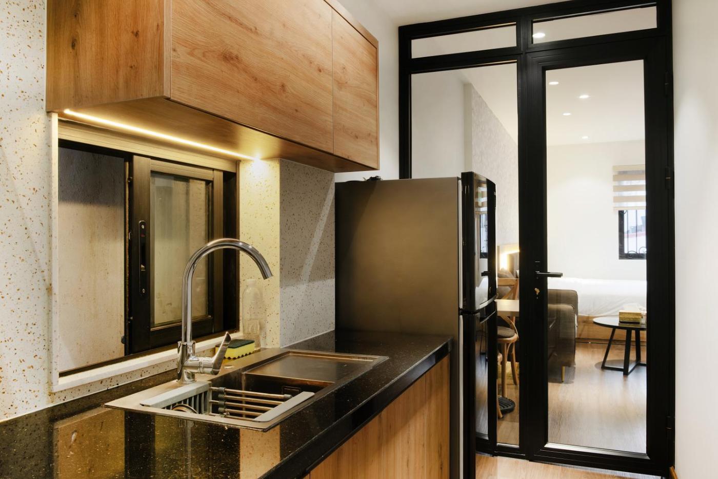 One-Bedroom Apartment with Balcony. The air-conditioned apartment features 1 bedroom and 1 bathroom with a shower and a hairdryer. The fully equipped kitchen has a stovetop, a refrigerator, kitchenware and a microwave. Featuring a balcony with city views, this apartment also provides a washing machine and a flat-screen TV. The unit offers 1 bed. ;